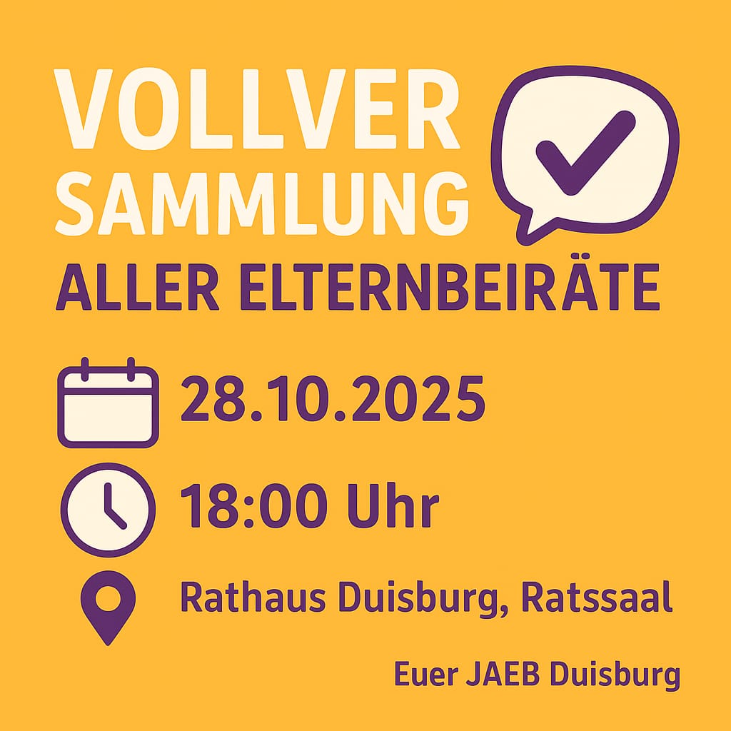 Am 28.10.2025 um 18:00 Uhr im Rathaus Duisburg (Ratssaal) treffen sich alle Elternbeiräte der Kindertageseinrichtungen und der Kindertagespflege. ✨
